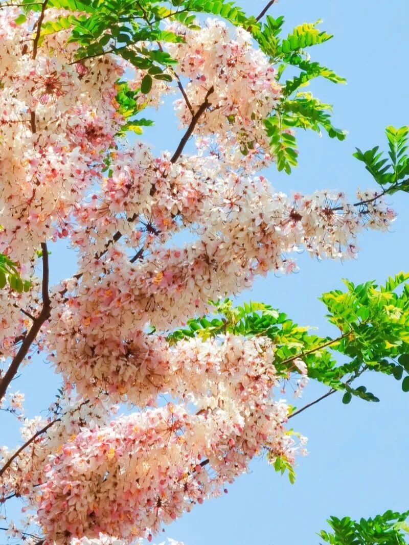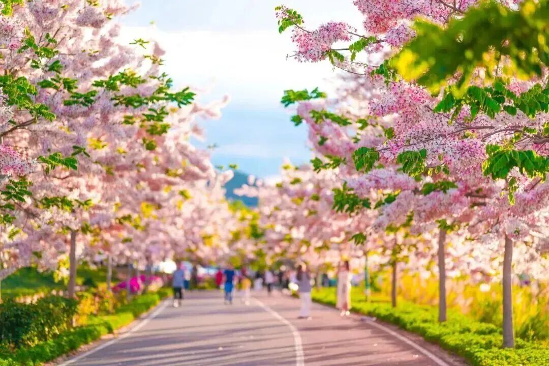 微風(fēng)拂過,粉白的花瓣輕柔搖曳,陽光透過枝葉灑下斑駁光影,為這片粉色云霧增添了幾分夢幻。